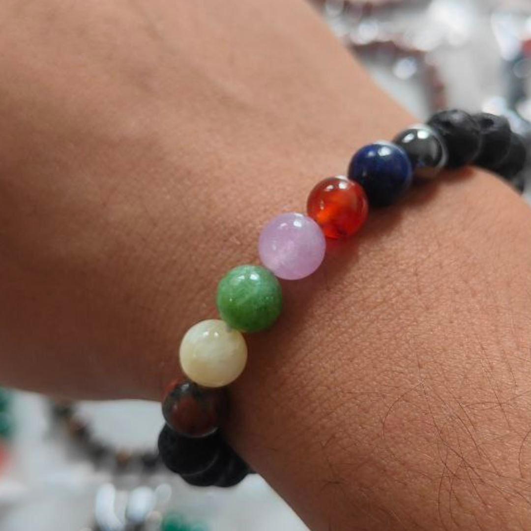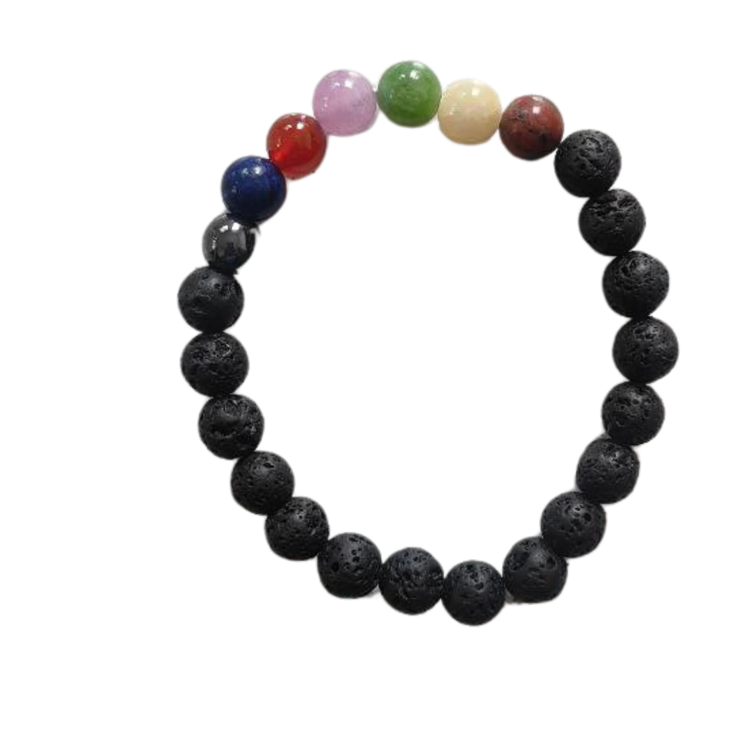Balance all seven chakras in one stylish coil. Center beads feature Red Jasper, Carnelian, Citrine, Green Aventurine, Lapis Lazuli, Amethyst, and Clear Quartz—each targeting a specific chakra point—flanked by matte black lava stones that ground excess energy. Add a drop of essential oil to the lava and enjoy hours of natural aromatherapy. Stretch cord fits most wrists; beads stay cool and comfortable during workouts or meditation. Delivered in a kraft gift box with a chakra guide and oil-application tip sheet.